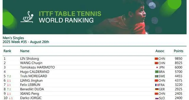 男单排名呈现多国竞争格局,中国选手林诗栋、王楚钦占据前两位,日本选手张本智和与巴西选手卡尔德拉诺紧随其后。瑞典站男单冠军莫雷加德排名上升至第五位,成为欧洲选手最高排名。