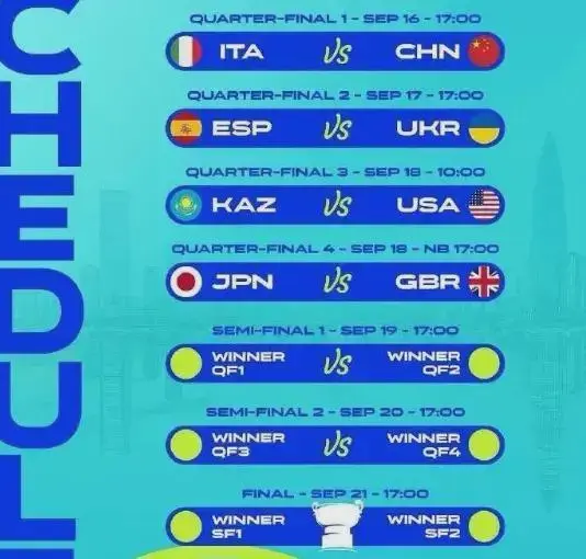 中国队最终参赛阵容确定为王欣瑜、袁悦、张帅、王曦雨和蒋欣玗五人。根据赛程安排,中国队将于9月16日下午17点首战对阵意大利队。郑钦文原计划在此赛事复出,但考虑到术后恢复情况,选择推迟复出时间。