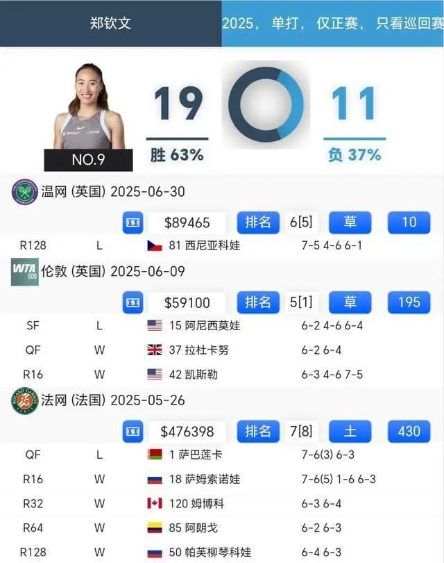 本赛季郑钦文受困伤病,竞技状态较上赛季有所下滑,尚未打入任何巡回赛决赛。温网首轮出局后,她宣布接受手术治疗并缺席北美赛季,导致积分损失。目前其世界排名暂列第九位,较赛季初有所下降。