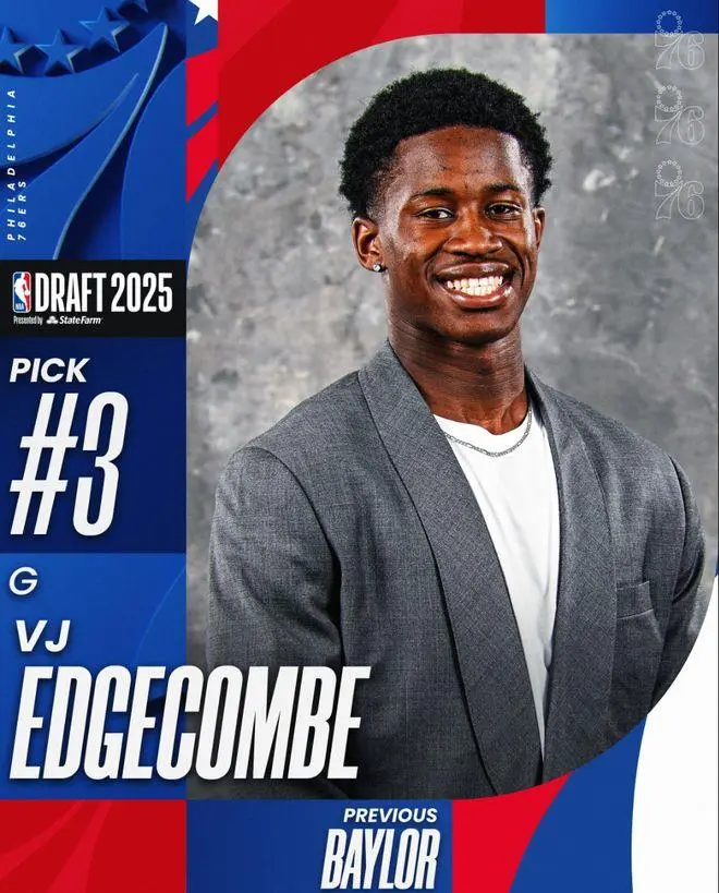 北京时间6月25日,2024年NBA选秀大会在纽约巴克莱中心举行,费城76人队用首轮第三顺位选中贝勒大学后卫VJ-埃奇库姆。这位20岁的锋卫摇摆人身高1米98,体重95公斤,预计将填补球队侧翼轮换位置。