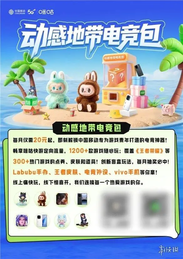 中国移动电竞包服务每月20元起,提供咪咕快游定向流量及《王者荣耀》等300余款游戏的点券、皮肤和道具。该服务还包含每月抽奖活动,奖品涵盖Labubu手办、游戏皮肤、电竞外设等。